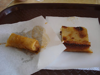 Pictures top-bottom: shrimp vesuvio, vegetarian lumpia and surinam bojo cake, Dutch cheese and crackers, green mussels.